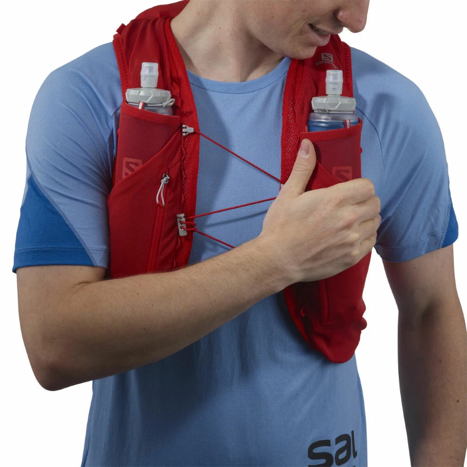 The Salomon Advanced Skin 12 Set Hydration Vest boasts a functional and comfortable design including a Sensifit construction, Quick Link sternum strap, a variety of storage options, two 500ml flasks and an insulated bladder sleeve.